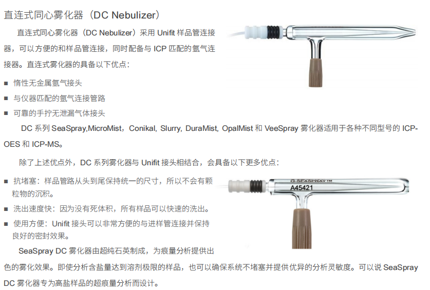 霧化器是 ICP 進樣系統(tǒng)的關(guān)鍵組件之一。GE 從 1980 年代初開始從事霧化器的制造,并不斷更新其設(shè)計以提高性能和易用性。GE 霧化器設(shè)計包括厚壁的 VitriConeTM 毛細管、UniFit 樣品管連接器和 DC 氣體管連接器。ICP 實驗室無論是分析干凈水樣、含有 HF 和 / 或高溶解鹽的樣品或含揮發(fā)性有機溶劑的樣品,GE 都可以提供適合的霧化器產(chǎn)品。