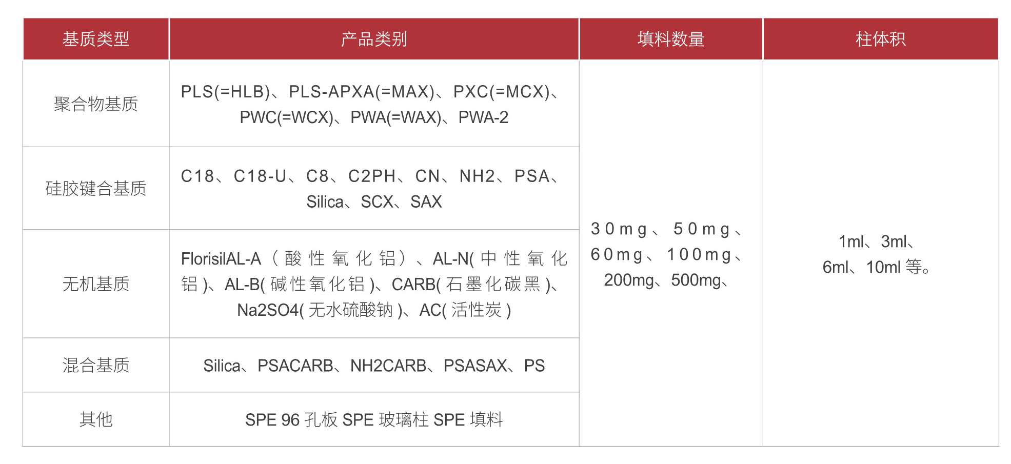 常見SPE填料包括:正相、反相、離子交換和混合型固相萃取柱及填料,可根據(jù)分離樣品的性質(zhì)和干擾物的性質(zhì),選擇不同固定相的SPE填料。