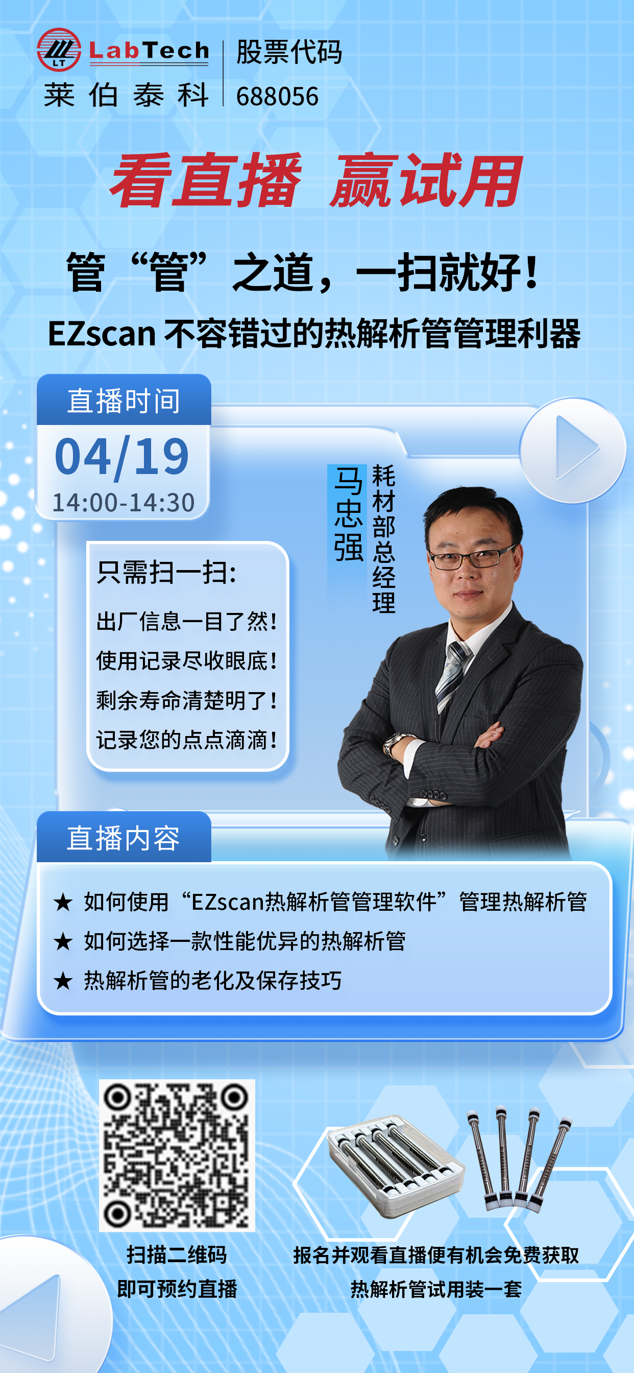 EZscan熱解析管管理軟件,完美解決您的問題! EZscan是萊伯泰科推出的一款基于安卓系統(tǒng)的網(wǎng)絡(luò)版熱解析管管理軟件,只要您有一部安卓手機(jī)或平板電腦,隨時(shí)隨地都可以掃出熱解析管的使用信息和記錄。即使在野外,只要有網(wǎng)絡(luò)在,就可以隨時(shí)掃描和記錄! 只需掃一掃,出廠信息一目了然! 只需掃一掃,使用記錄盡收眼底! 只需掃一掃,剩余壽命清楚明了! 只需掃一掃,記錄您的點(diǎn)點(diǎn)滴滴! 本次直播將為您展示: 1、如何使用“EZscan熱解管管理軟件”管理熱解析管? 2、如何選擇一款性能優(yōu)異的熱解析管? 3、熱解析管的老化及保存技巧! 報(bào)名并觀看直播有機(jī)會免費(fèi)獲取EZscan熱解管試用裝一套!