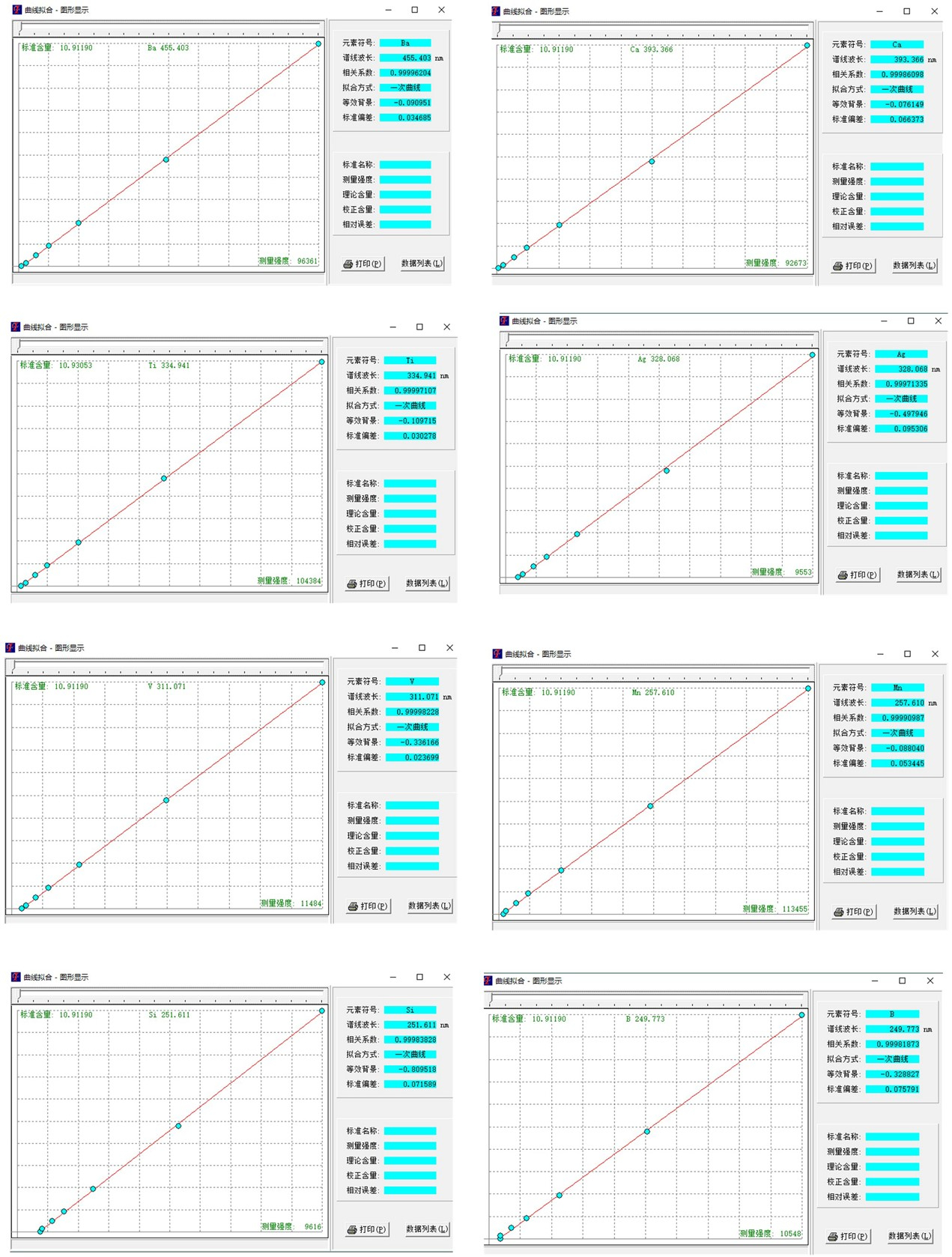 圖2 部分元素標準曲線