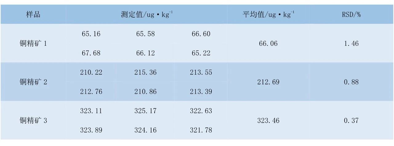 選取3個含不同濃度汞的銅精礦樣品,進行6次平行測定,精密度試驗結(jié)果見表3。