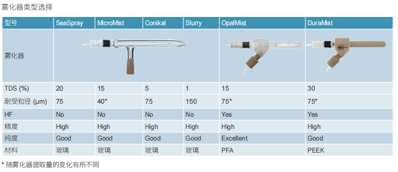 霧化器是 ICP 進樣系統(tǒng)的關(guān)鍵組件之一。GE 從 1980 年代初開始從事霧化器的制造,并不斷更新其設(shè)計以提高性能和易用性。GE 霧化器設(shè)計包括厚壁的 VitriConeTM 毛細管、UniFit 樣品管連接器和 DC 氣體管連接器。ICP 實驗室無論是分析干凈水樣、含有 HF 和 / 或高溶解鹽的樣品或含揮發(fā)性有機溶劑的樣品,GE 都可以提供適合的霧化器產(chǎn)品。