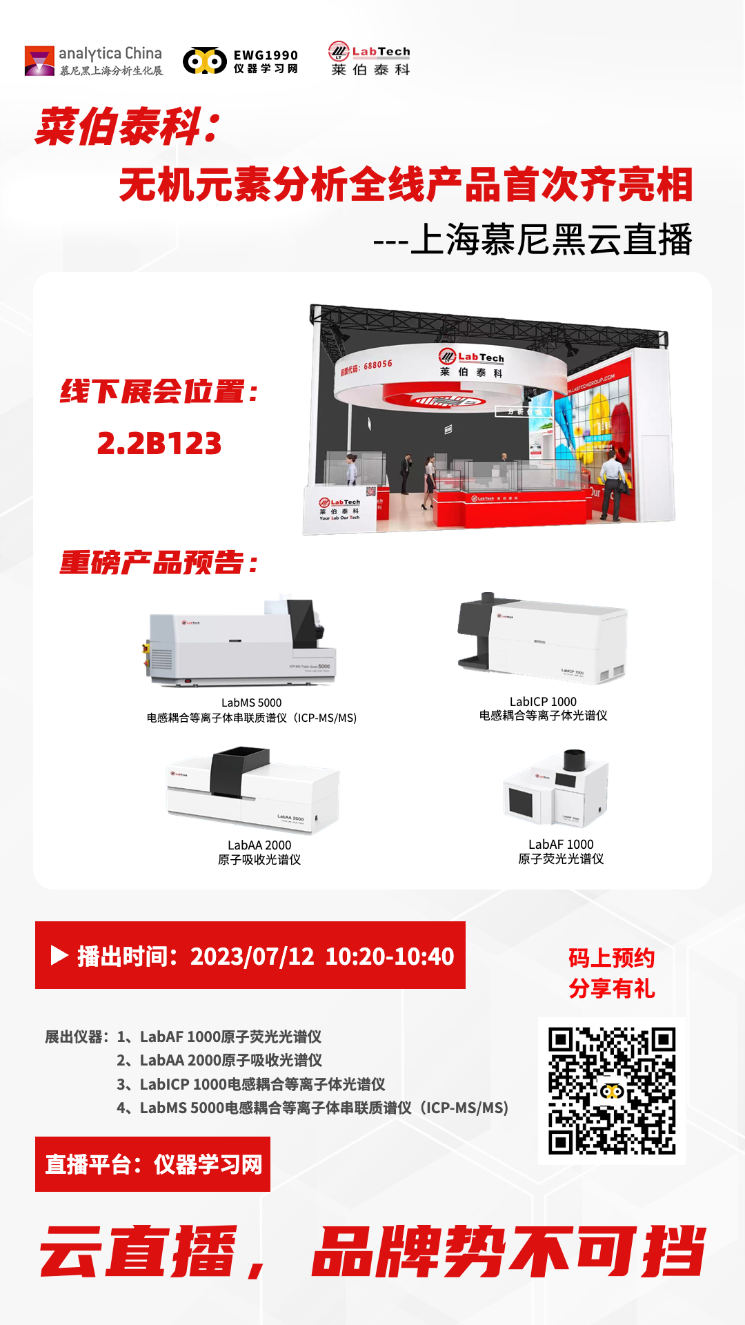2023年上半年,萊伯泰科大動(dòng)作頻頻,強(qiáng)勢(shì)發(fā)布五款新品,包括LabMS 5000電感耦合等離子體串聯(lián)質(zhì)譜儀、LabAA 2000原子吸收光譜儀、LabAF 1000原子熒光光譜儀、LabICP 1000電感耦合等離子體發(fā)射光譜儀及PT3000全自動(dòng)固液吹掃捕集儀?,F(xiàn)場(chǎng)不僅有真機(jī)展示,更有配套解決方案及產(chǎn)品經(jīng)理解答疑問(wèn),精彩介紹不容錯(cuò)過(guò)!