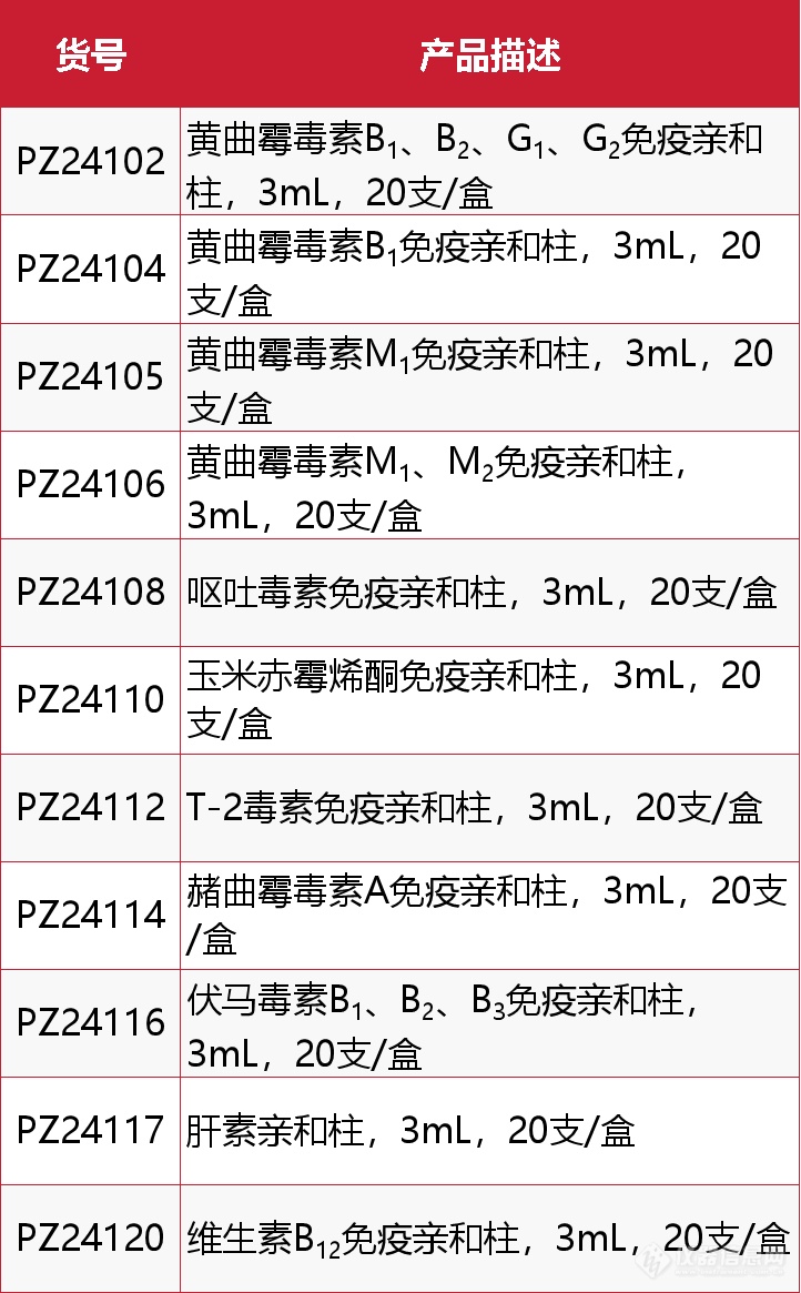 GB 5009.240-2023食品安全國家標準《食品中伏馬菌素的測定》已于2023-09-06正式發(fā)布,并將于2024-03-06正式實施,標準中的樣品凈化需要使用免疫親和柱來完成。為助力新標準的實施,為相關實驗室的擴項或檢測工作提供產(chǎn)品支持,即日起至12月31日,北京萊伯帕茲檢測科技有限公司如下免疫親和柱年終大促。